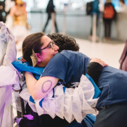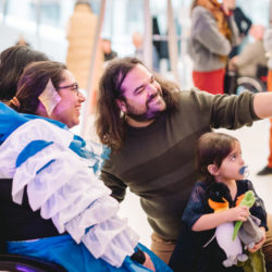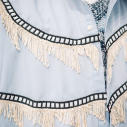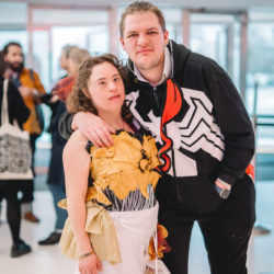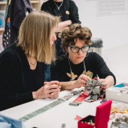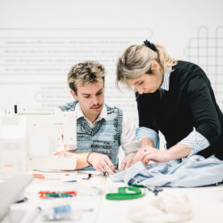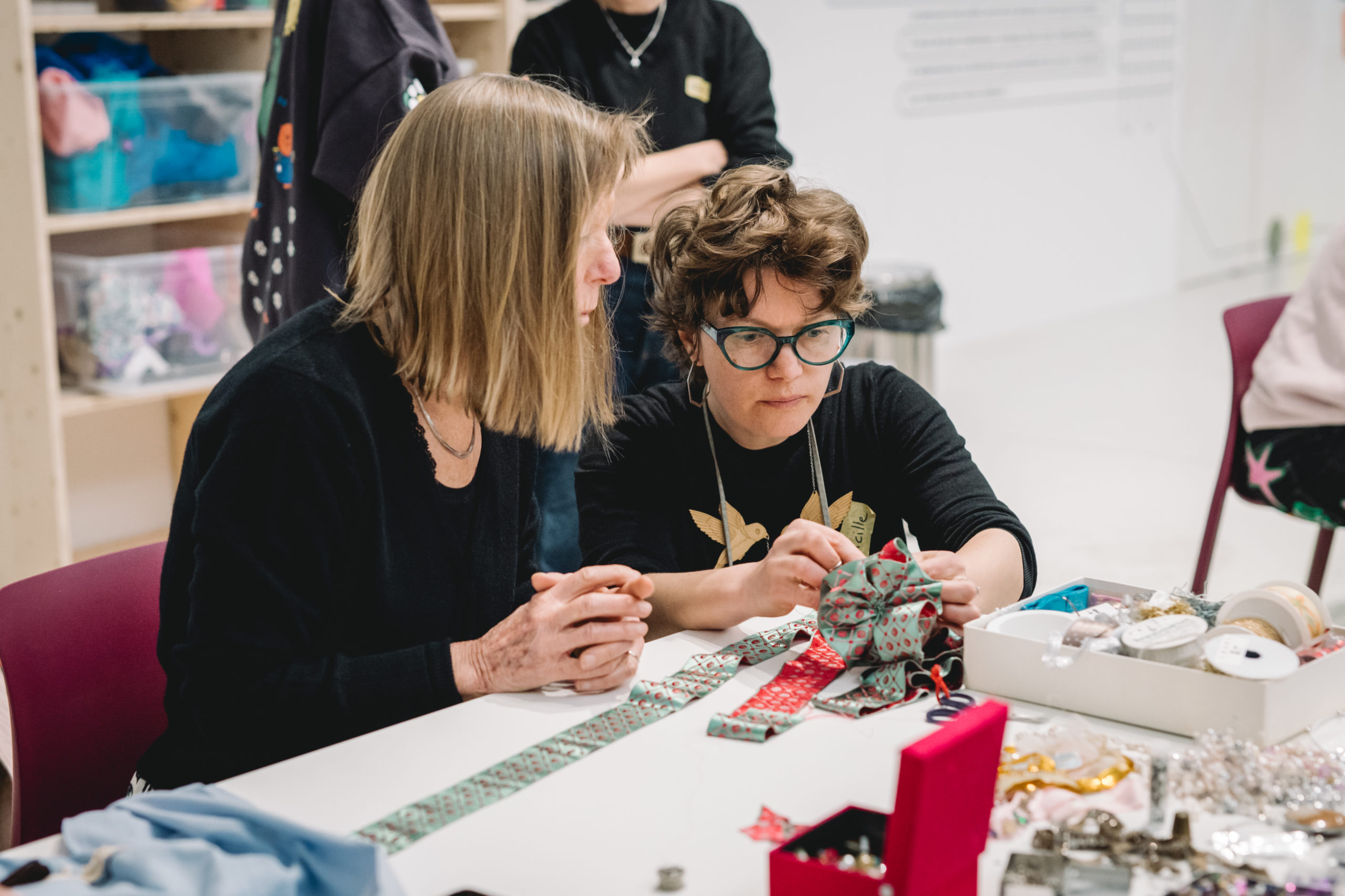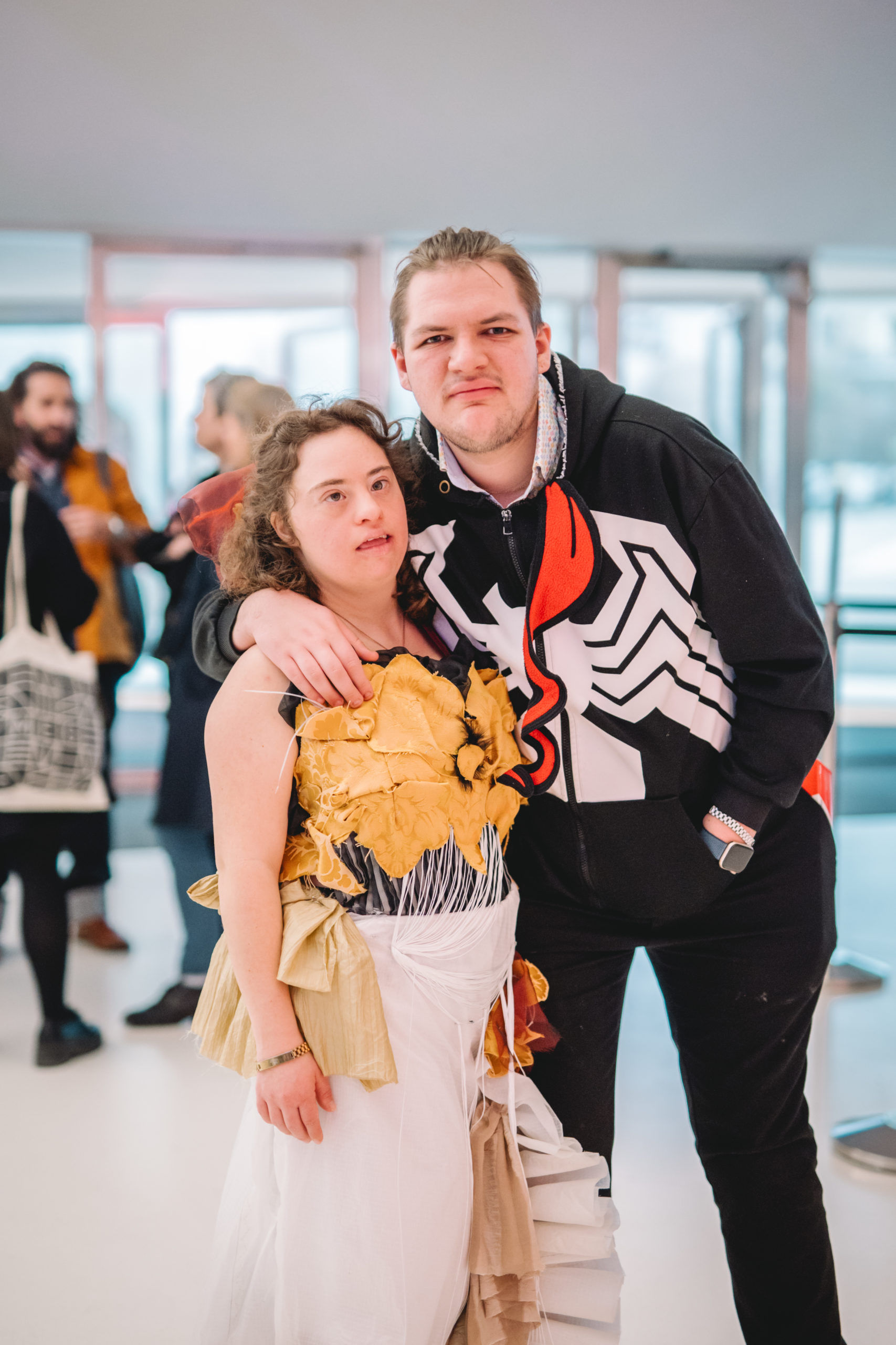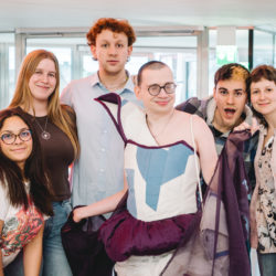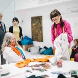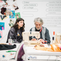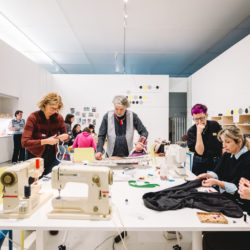 Le matin, l’atelier des publics a accueilli La Trame, une association qui développe dans son arcade à Lausanne une approche durable de la mode et une pratique relationnelle autour du textile, à travers la vente d’habits de deuxième main, un atelier de retouches et des cours de couture. Les responsables de l’association ont installé tout le nécessaire pour customiser les habits amenés par les participant.e.s, qui les ont transformés en une pièce unique s’inspirant de l’univers de Kevin Germanier. Après une visite de l’exposition par Marie Jolliet, les participant.es ont choisi outils et matériaux disponibles pour développer leurs projets personnels. ASA-HM a convié à cet atelier deux artistes du BSB Kreativwerkstatt – Bürgerspital Basel, Pedro Gonzalez et Anna Speranza, et Chiara Severino, qui a réalisé une vidéo pour notre blog autour du shopping accessible au centre commercial Balexert de Genève. Trois étudiantes du CFP Arts – Création de vêtements les ont assistés dans la réalisation de leurs projet.