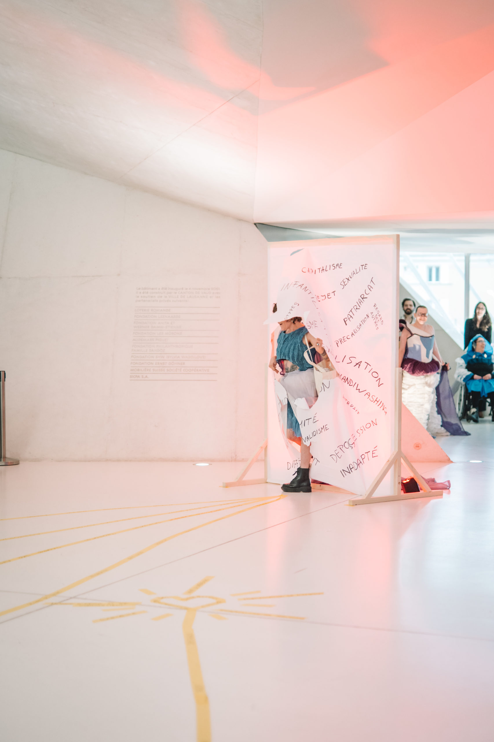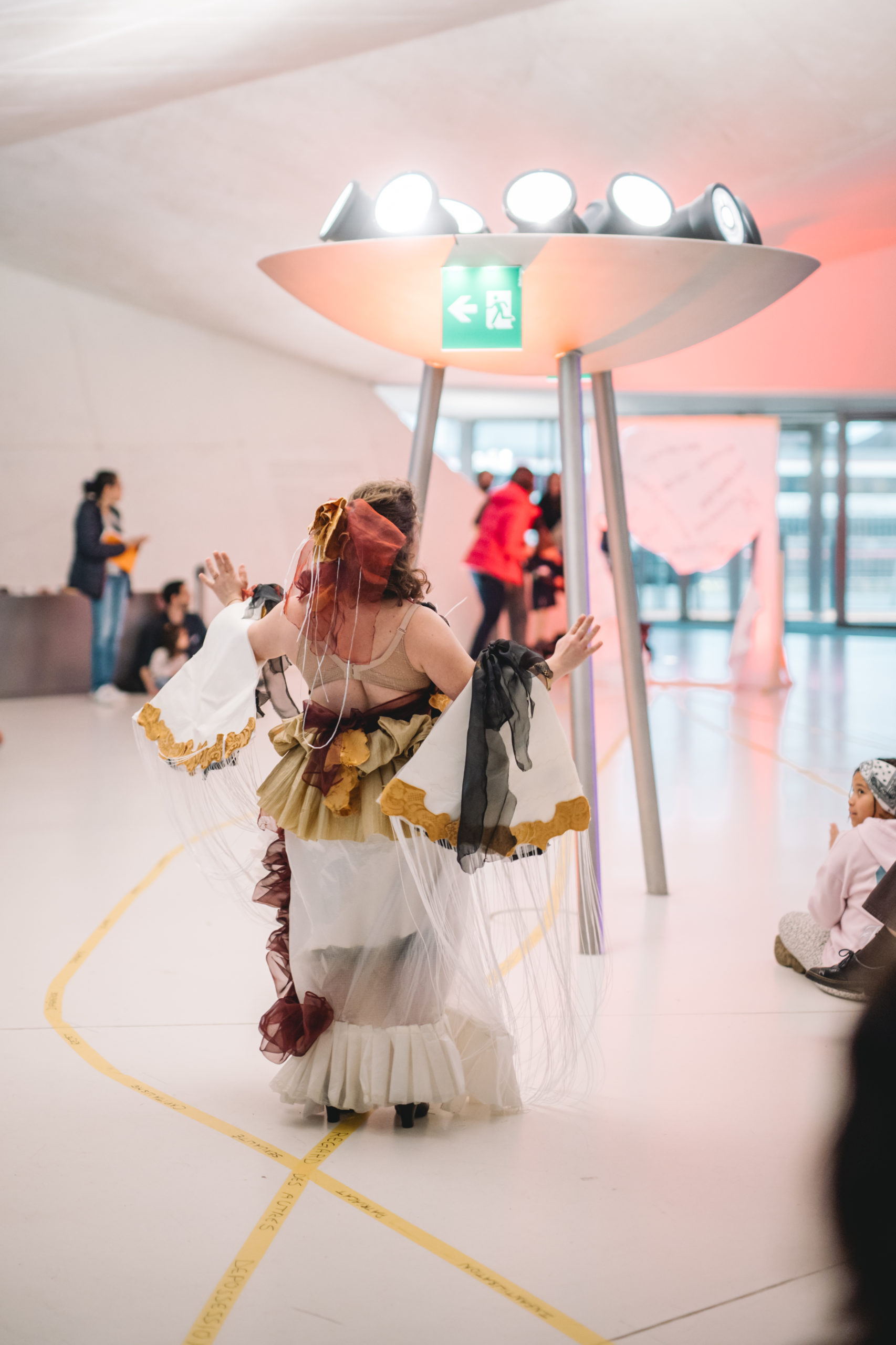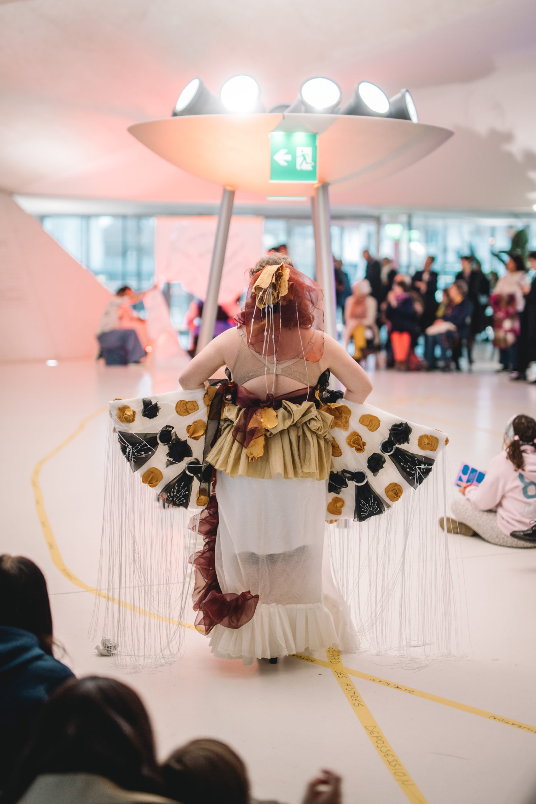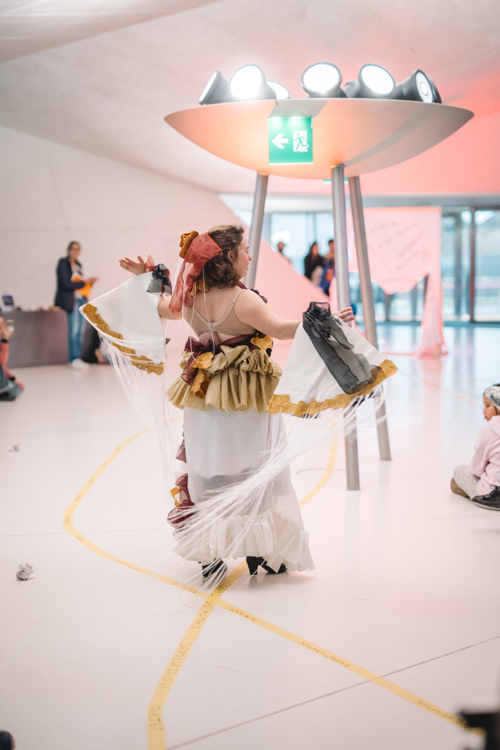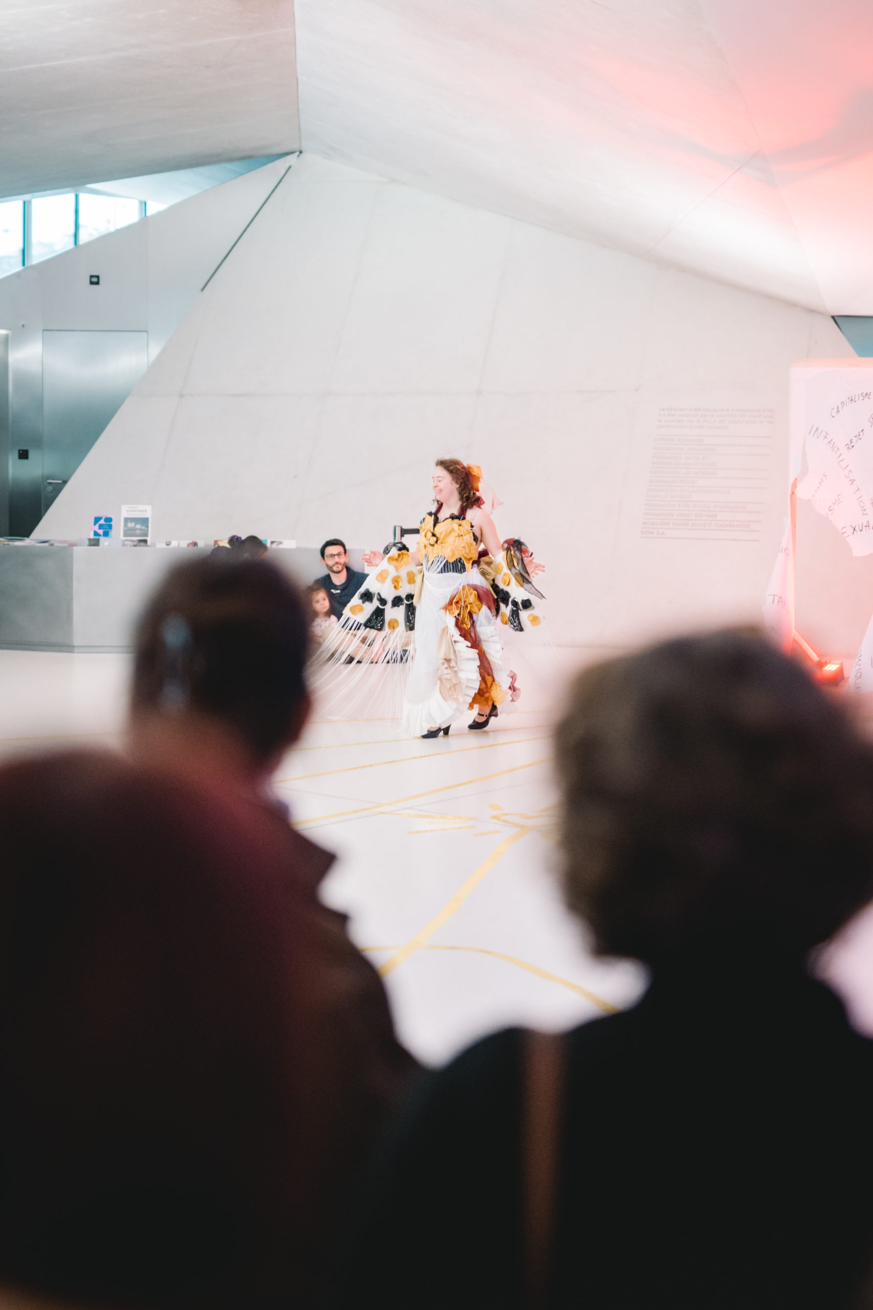 En clôture de la journée, les étudiant.e.s de la HEAD ayant participé au workshop Les Merveilleuses ont présenté avec Lucie Guiragossian les tenues réalisées sous la forme d’un défilé en musique dans le hall du musée.