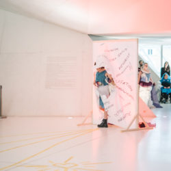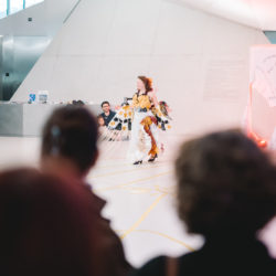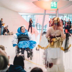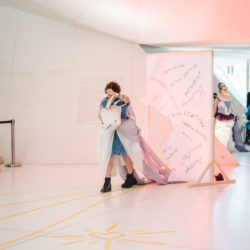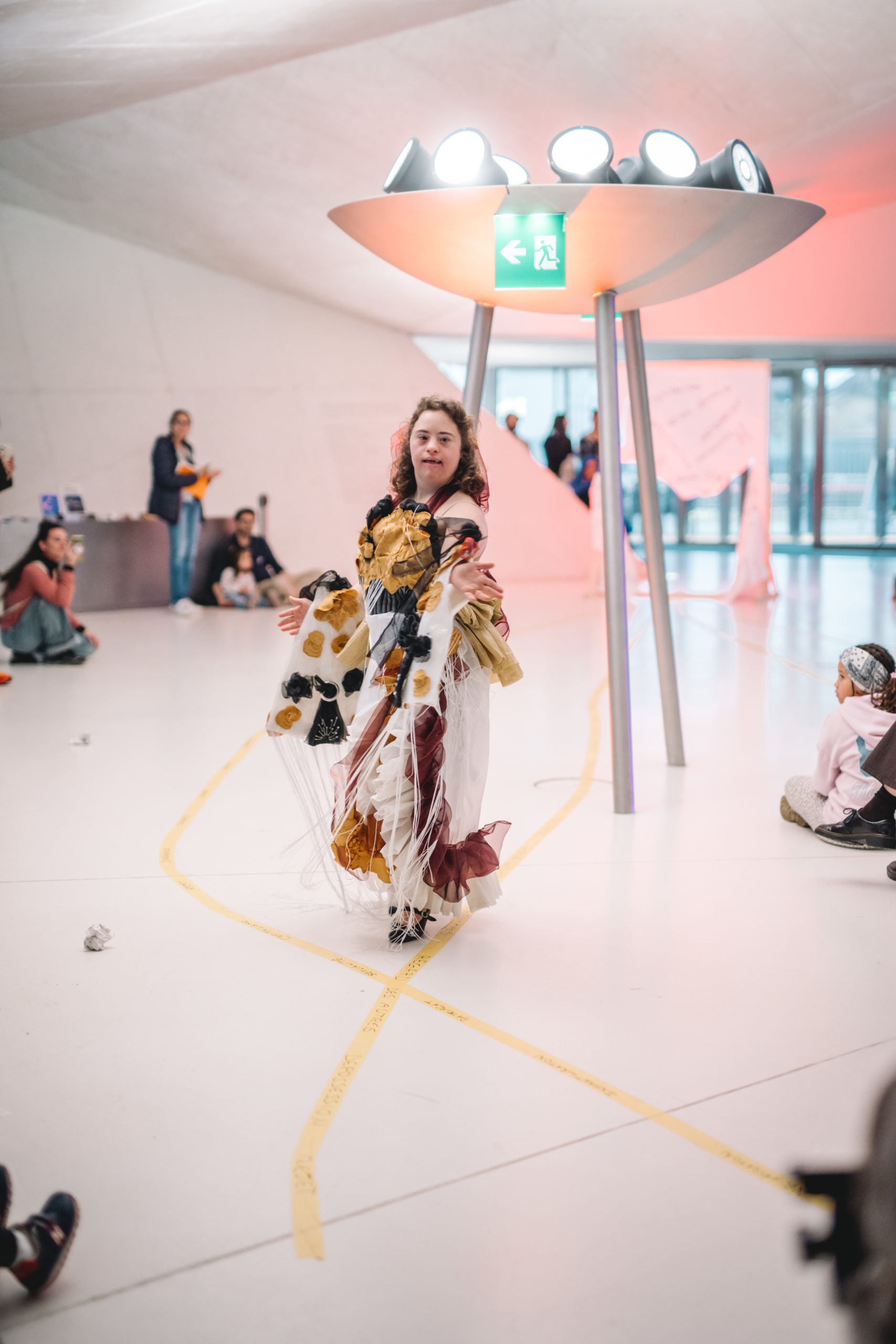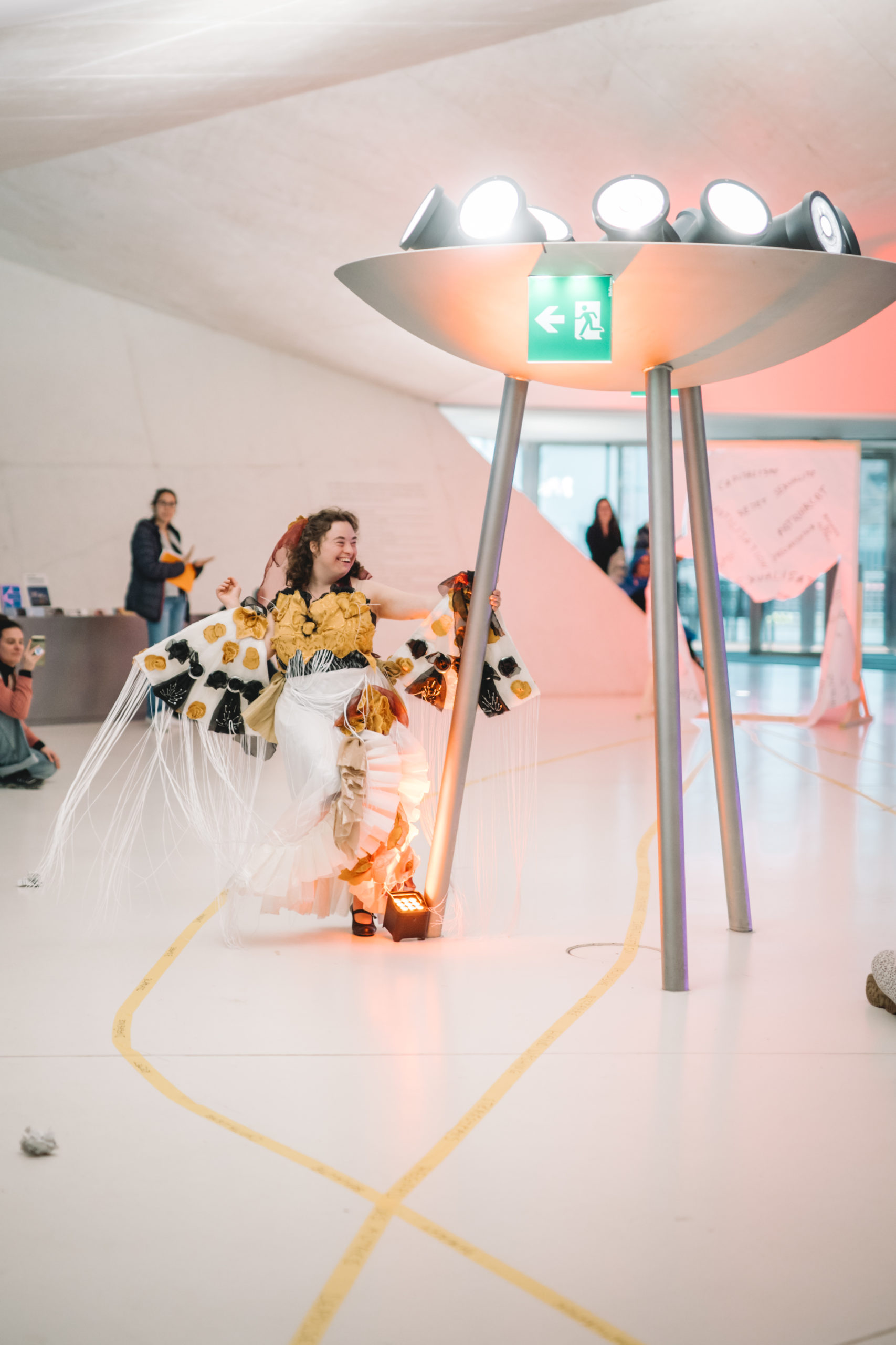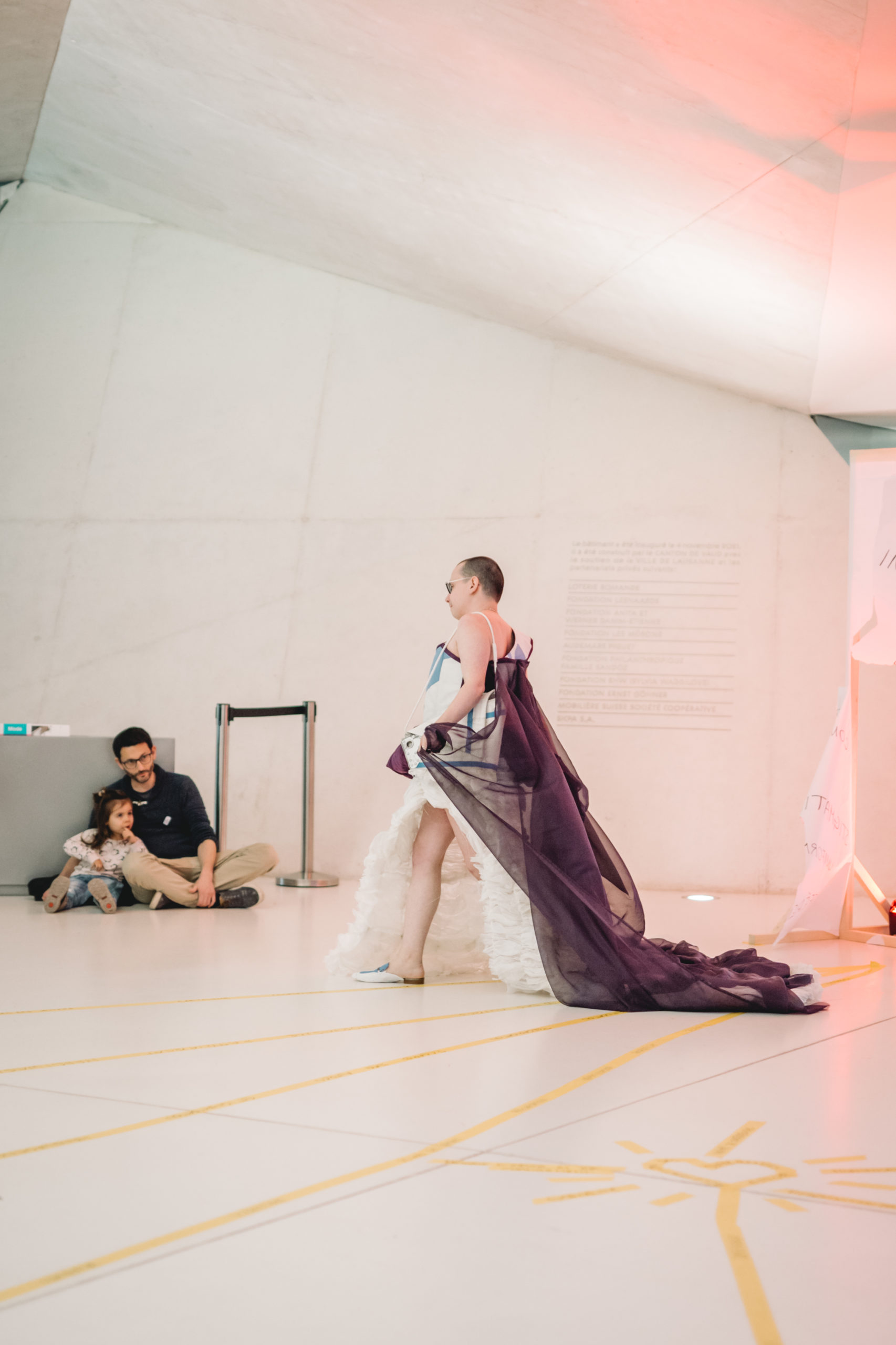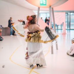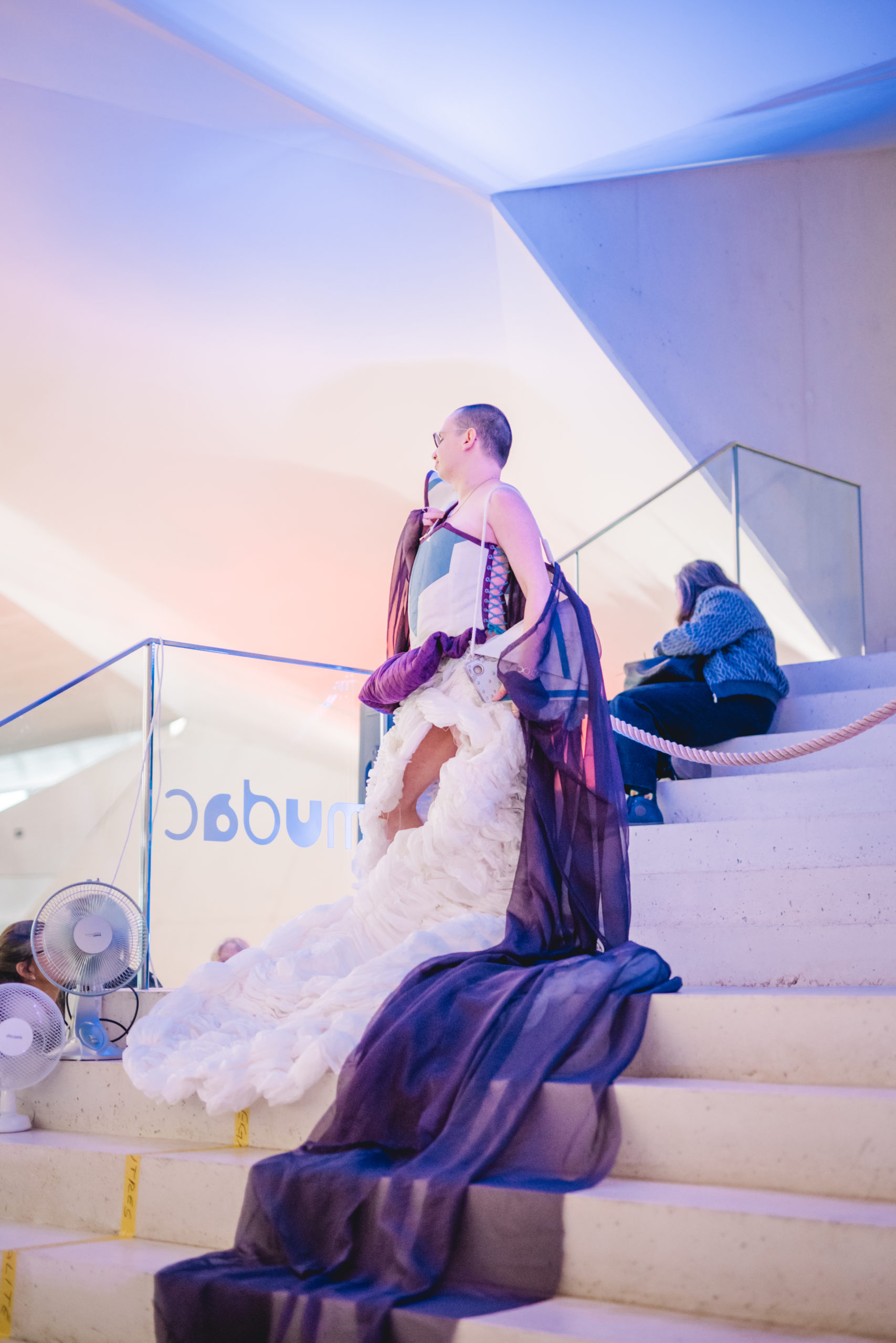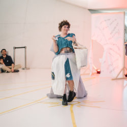 En clôture de la journée, les étudiant.e.s de la HEAD ayant participé au workshop Les Merveilleuses ont présenté avec Lucie Guiragossian les tenues réalisées sous la forme d’un défilé en musique dans le hall du musée.
