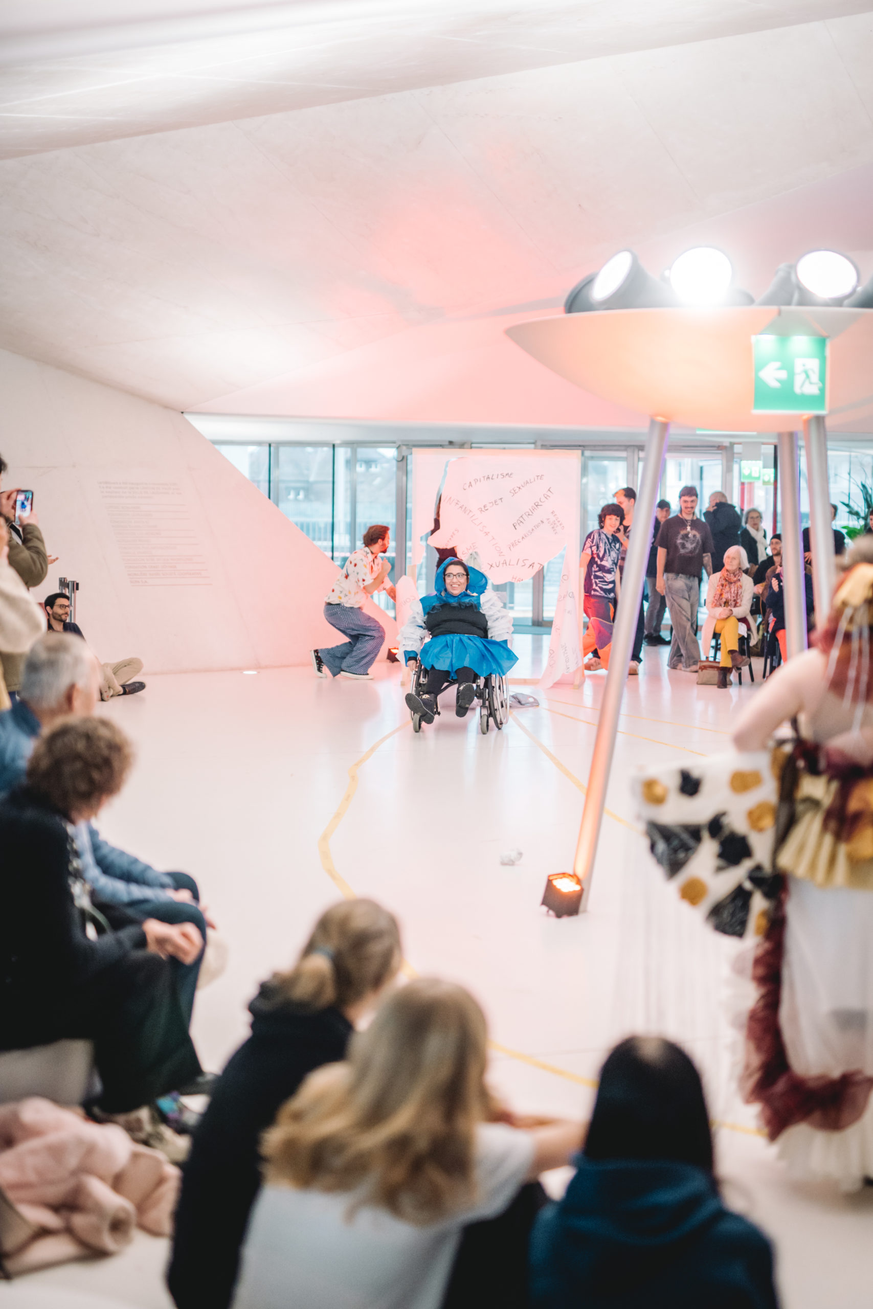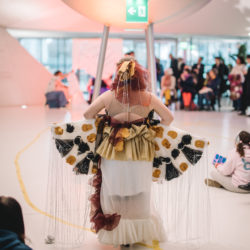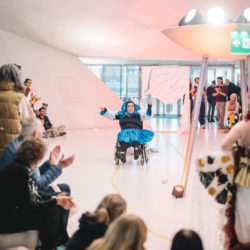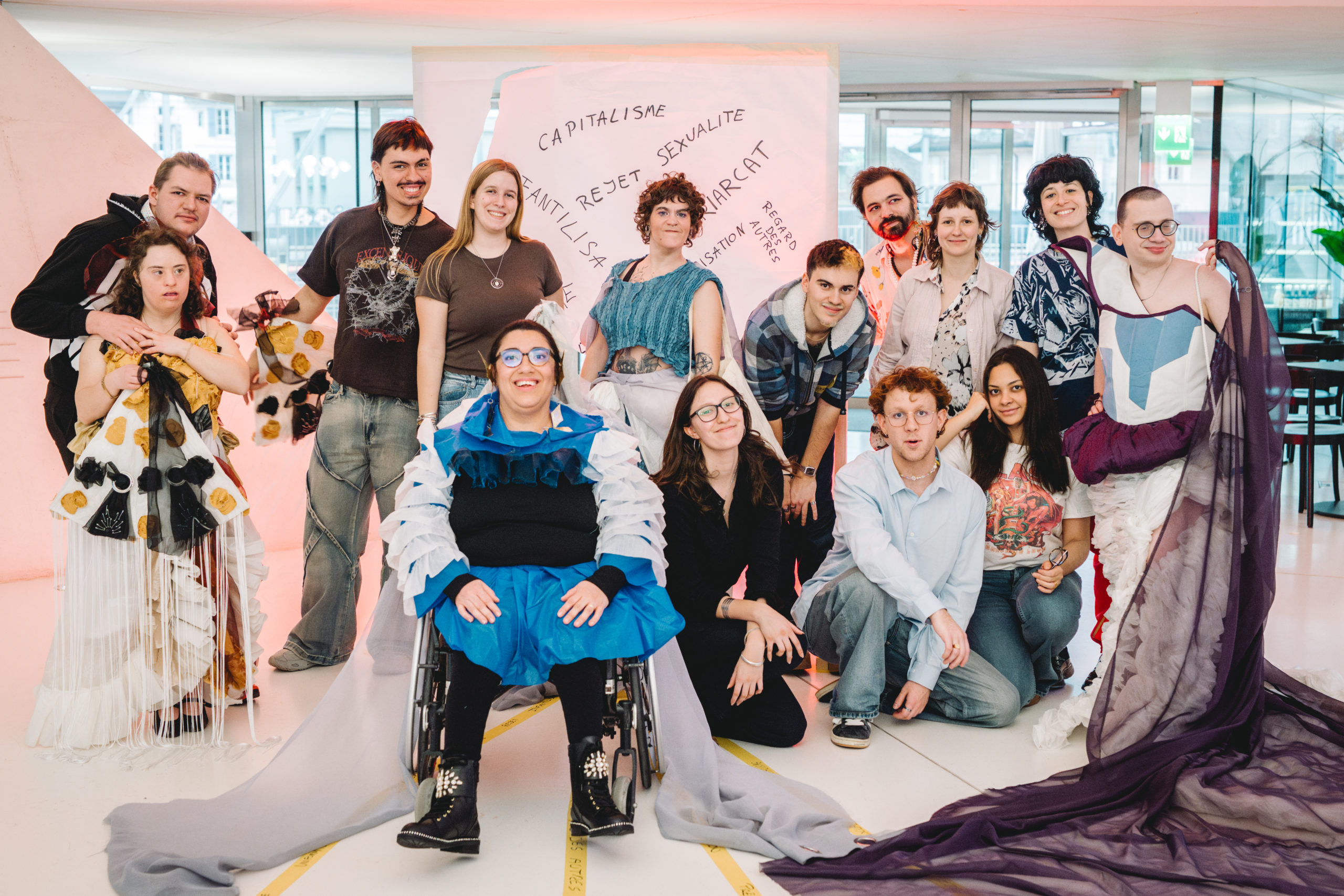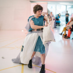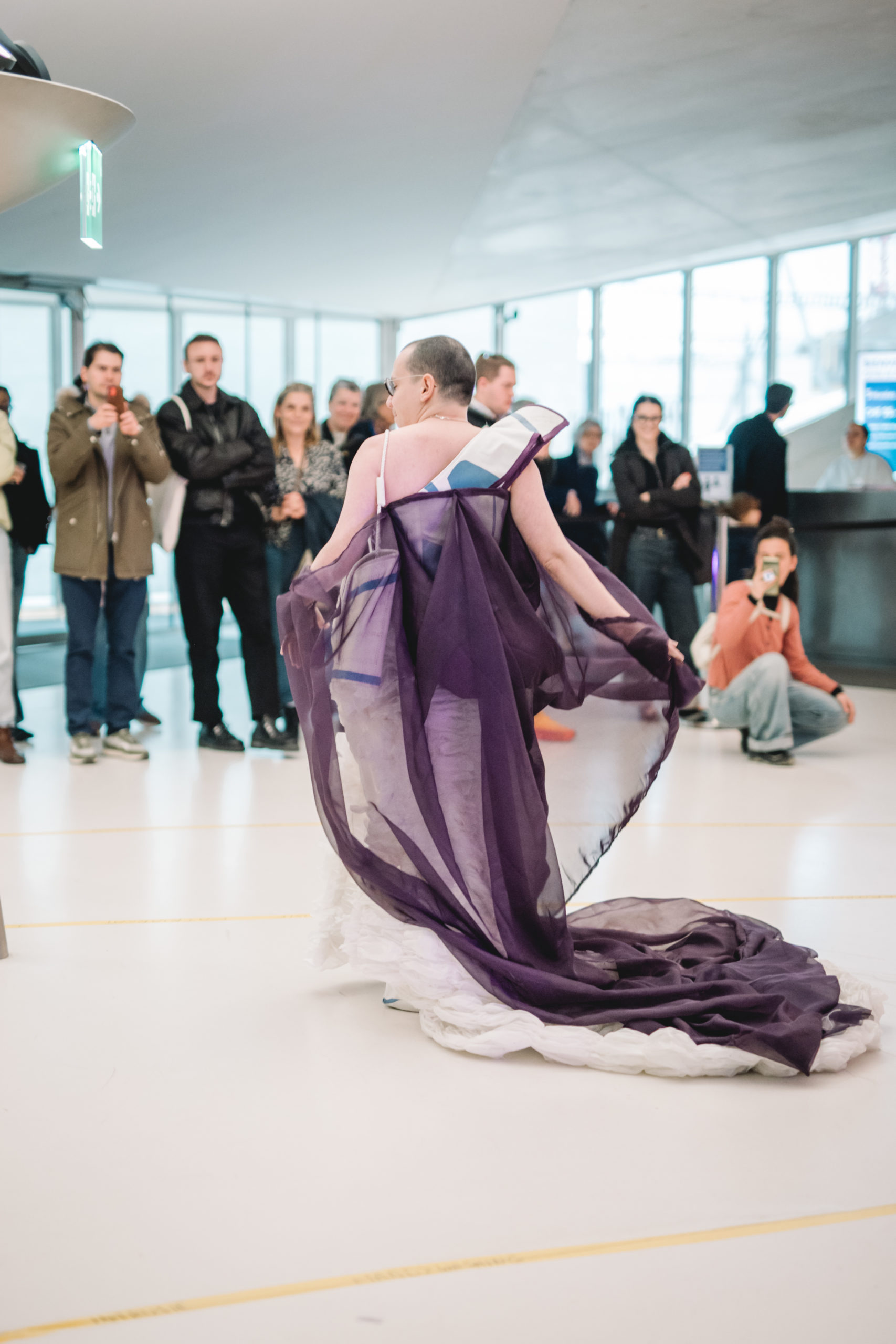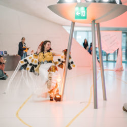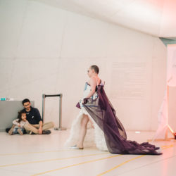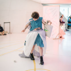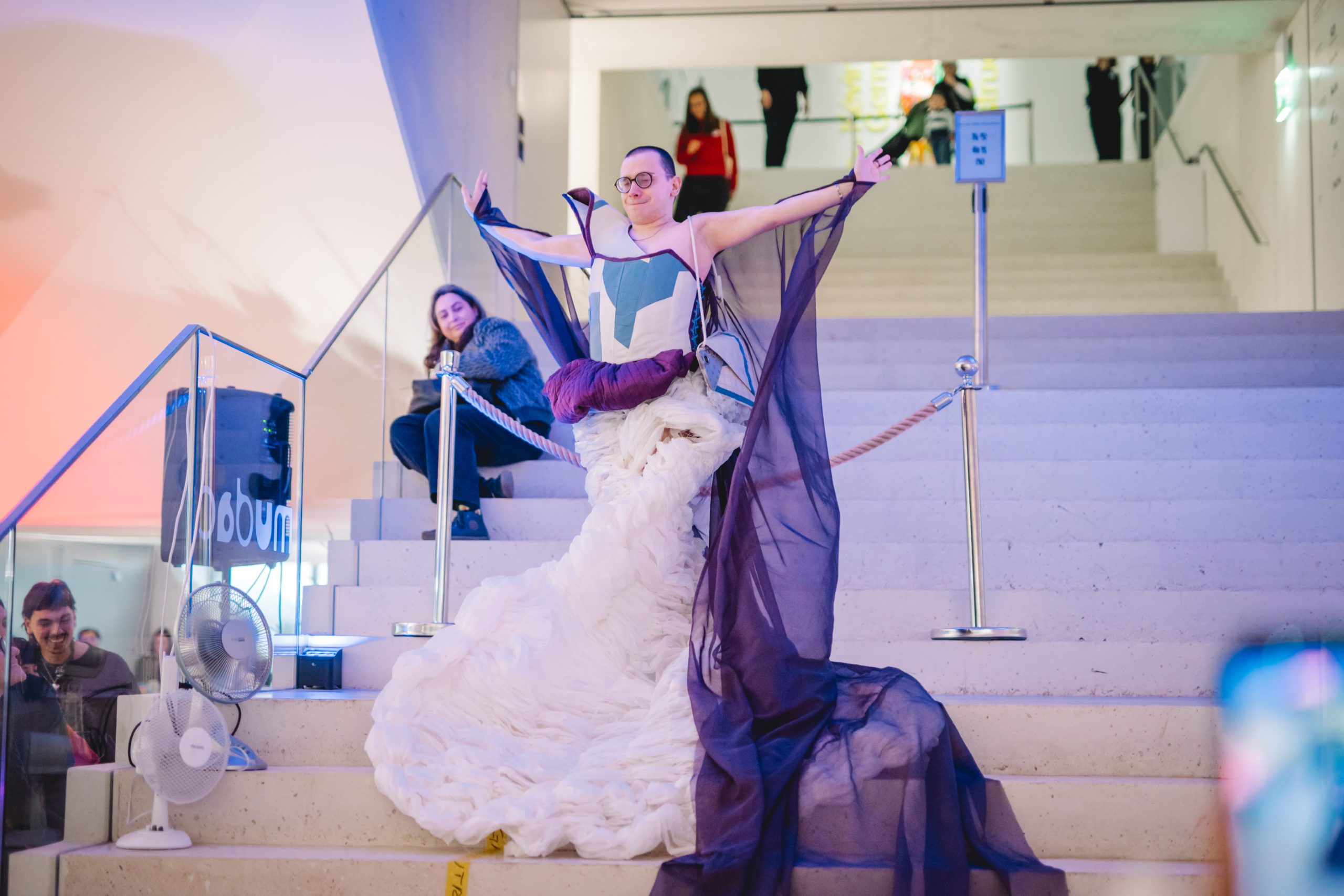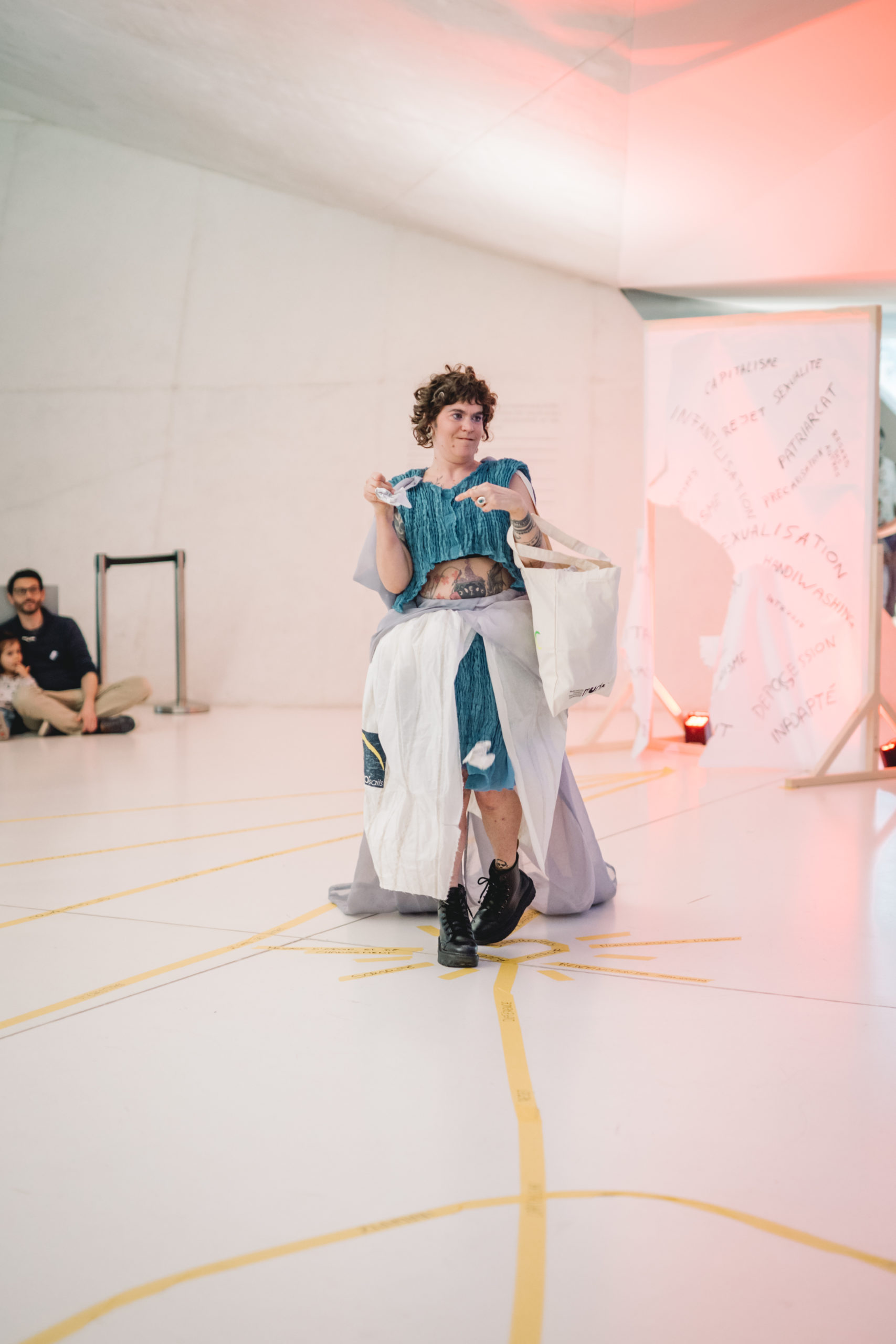 En clôture de la journée, les étudiant.e.s de la HEAD ayant participé au workshop Les Merveilleuses ont présenté avec Lucie Guiragossian les tenues réalisées sous la forme d’un défilé en musique dans le hall du musée.