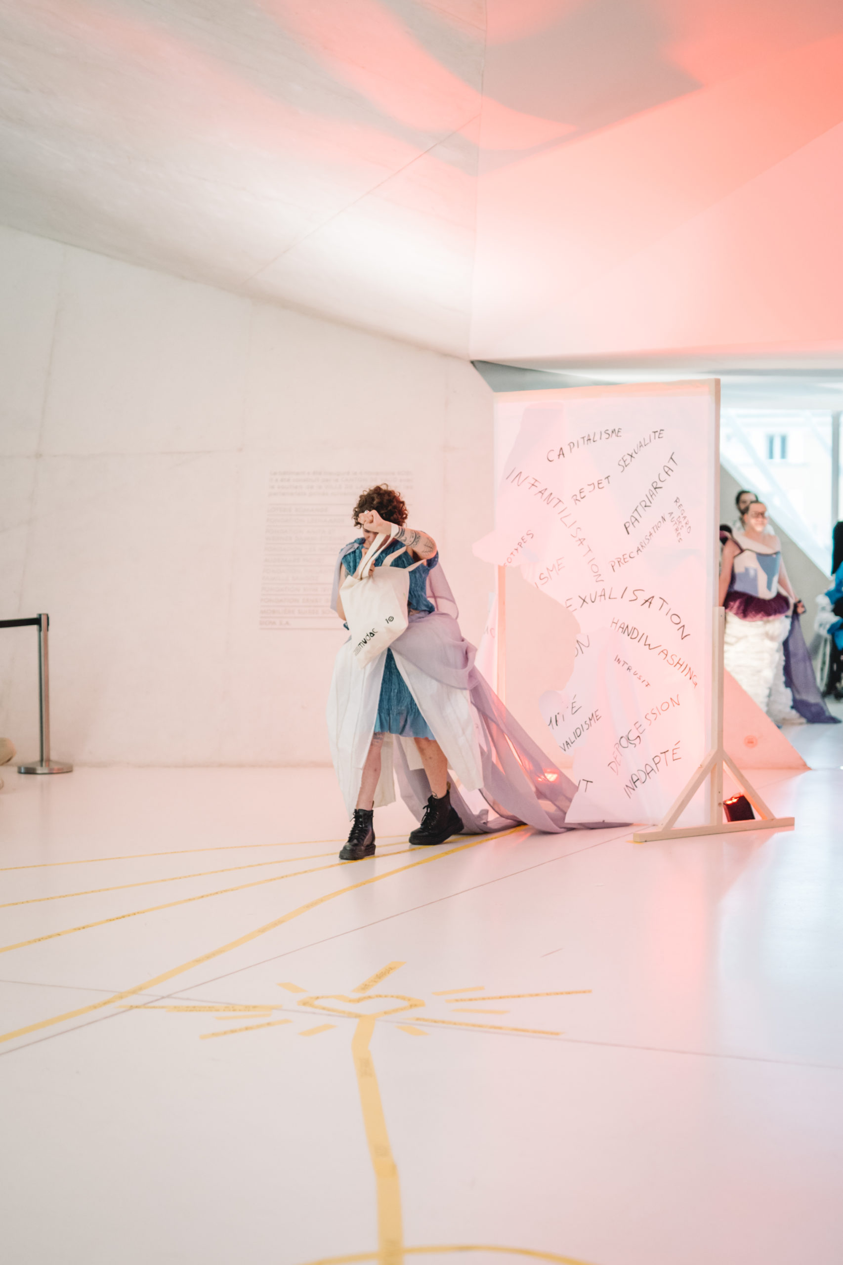 Anissa Chanchah, en robe inspirée de Marie-Antoinette version badass et féministe, a fait son entrée en brisant le mur de l’injustice sociale. Et elle a distribué en chemin une boule de papier avec à l’intérieur un texte qu’elle avait rédigé.