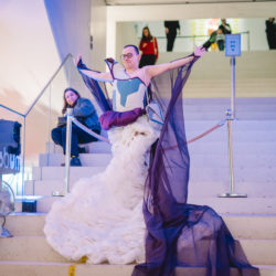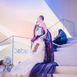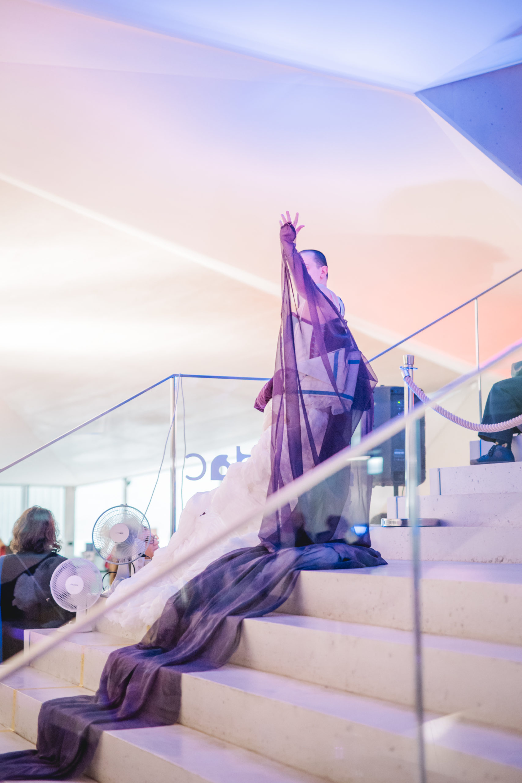 Alex Droz a posé sur l’escalier du musée avec sa longue traine.