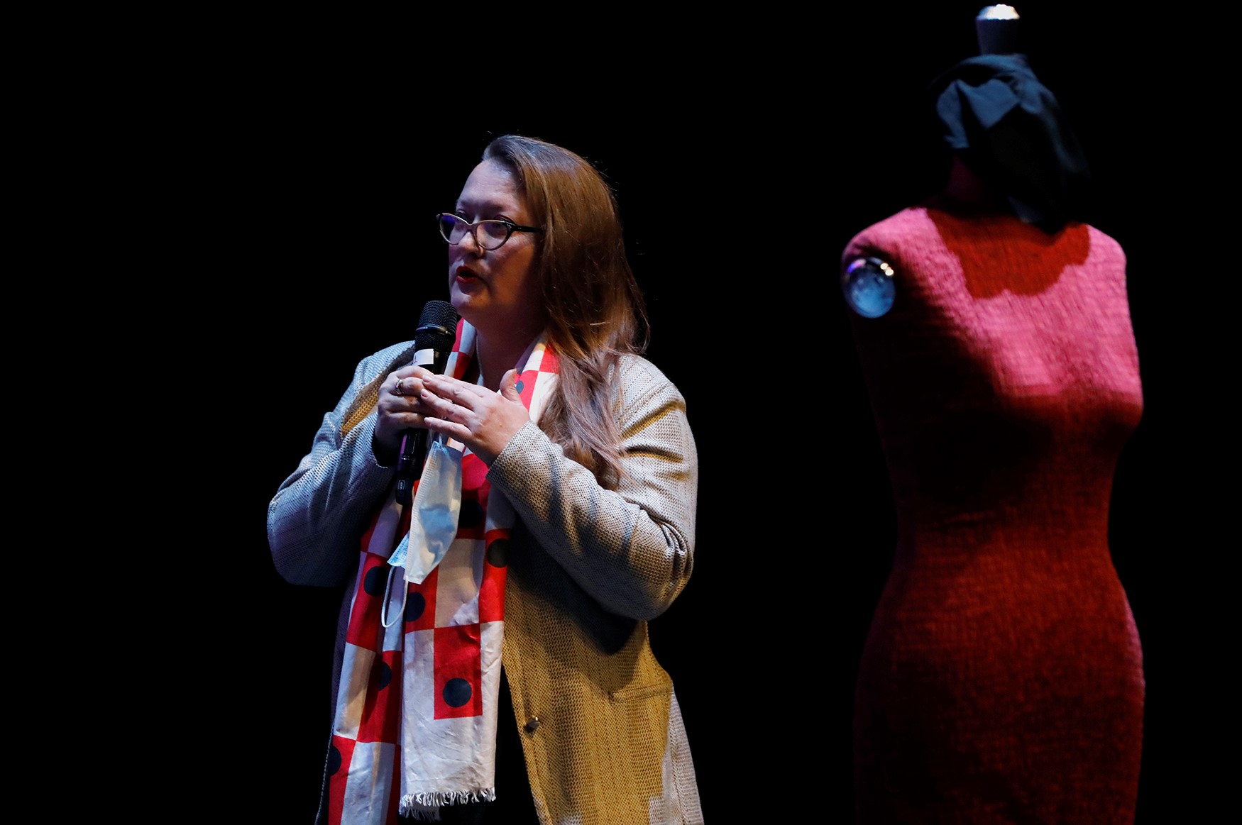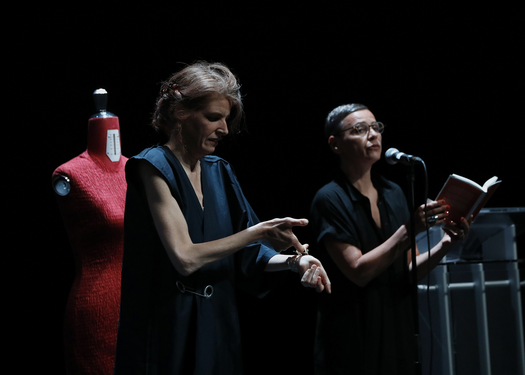 En guise de restitution poétique de cette expérience d’apprentissage mutuel, les deux danseuses ont présenté au colloque TU ES CANON la performance Corps 2 femmes. Assises en miroir l’une en face de l’autre, elles se sont déshabillées en même temps, au rythme d’une musique envoûtante. Puis, pendant que Maud s’habillait avec les tenues créées par les élèves et avançait dans un bref défilé, Caroline lisait des extraits du livre « Le corps des femmes, la bataille de l’intime » de Camille Froidevaux-Metterie. L’auteure française rappelle entre autres que le travail sur l’apparence est « la recherche d’une présentation de soi conforme non pas tant aux canons du beau tel qu’il est socialement prescrit, qu’aux critères personnels par lesquels l’image de soi corporelle entre en consonance avec l’image de soi subjective ».