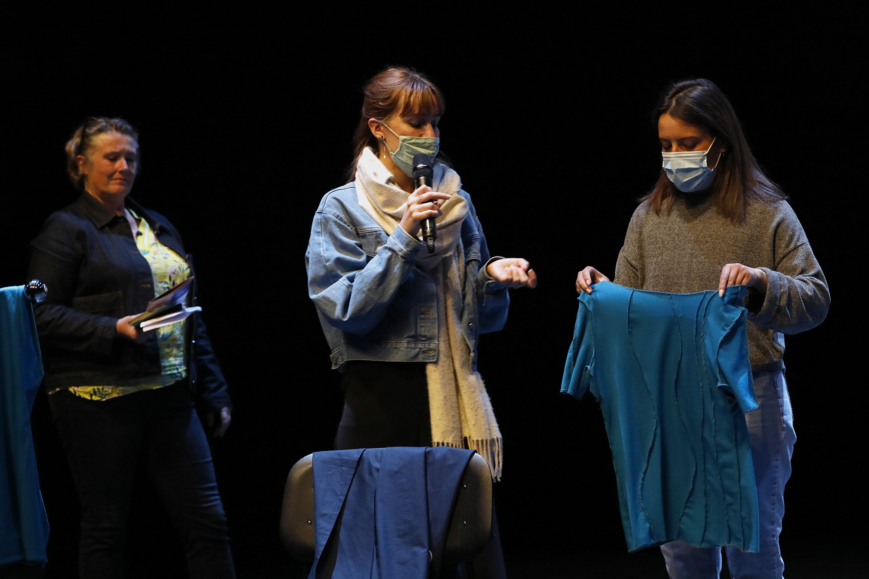 Au terme de cette performance chaleureusement saluée par le public, Sophie Raynard a remercié Maud pour la confiance dont elle a fait preuve pendant le workshop, en se mettant à nu et en dévoilant les désirs en matière de mode qu’elle ne s’était jusqu’à-là autorisés. Elle a ensuite présenté les deux hauts, avec deux manches ou une seule, qui ont été créés à partir d’un tissu légèrement élastique, d’une belle couleur bleu mettant en valeur le teint et la chevelure de Maud Leibundgut. Pour les rendre faciles à mettre et à enlever, ces hauts sont réversibles : on peut les porter à l’endroit ou à l’envers, et le devant est pareil au derrière. Pas besoin donc de perdre du temps et des énergies pour les mettre du bon côté. Les pantalons, en coton, larges en bas, portent un élastique à la taille qui remplace bouton et fermeture éclair, difficiles à manipuler. Une robe kimono par-dessus complète cette tenue. Elle aussi réversible, avec une manche longue et une plus courte, elle est dotée d’un double système de fermeture : avec un bouton aimanté, et avec des grands œillets traversés d’un crochet. Ce dernier est inspiré de l’épingle à nourrice dont Maud se sert, depuis son enfance, pour boutonner son jean.